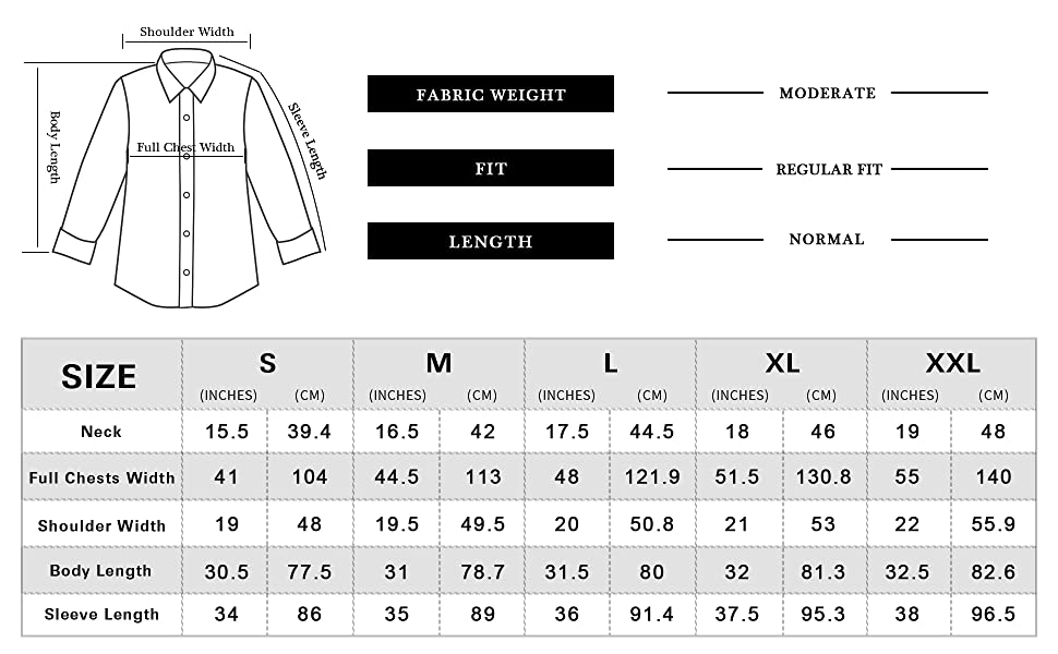 Feature: Accurate Size,Stylish and appealing: Our mens dress shirts are made based on USA button down regular fit long sleeve casual dress shirt size, Spread collar, buttoned cuffs, fits true to size. You can also refer to our size chart on pictures and details.