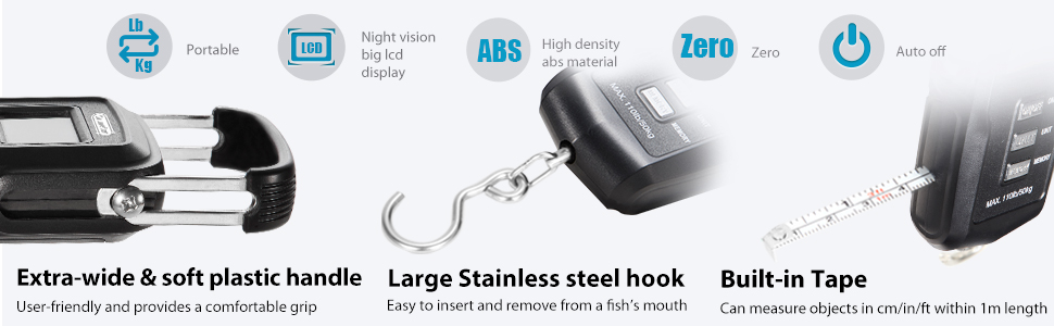 No tackle box is complete without the Dr. Meter Electronic Fishing Scale! This updated scale is our latest and greatest a crystal-clear LCD display specialized functions like memory storage, numeric comparison, unit conversion, tare, and more are perfect for amateur and avid fishermen alike. Simply turn it on, hang your catch on the stainless steel hook, and let Dr.meter do its thing. Need to measure length? We've included measuring tape to help you measure catches up to 3ft long. Not outdoorsy? No problem. This scale is a great tool to weigh your luggage and avoid expensive fees. Make life easier with Dr.meter!